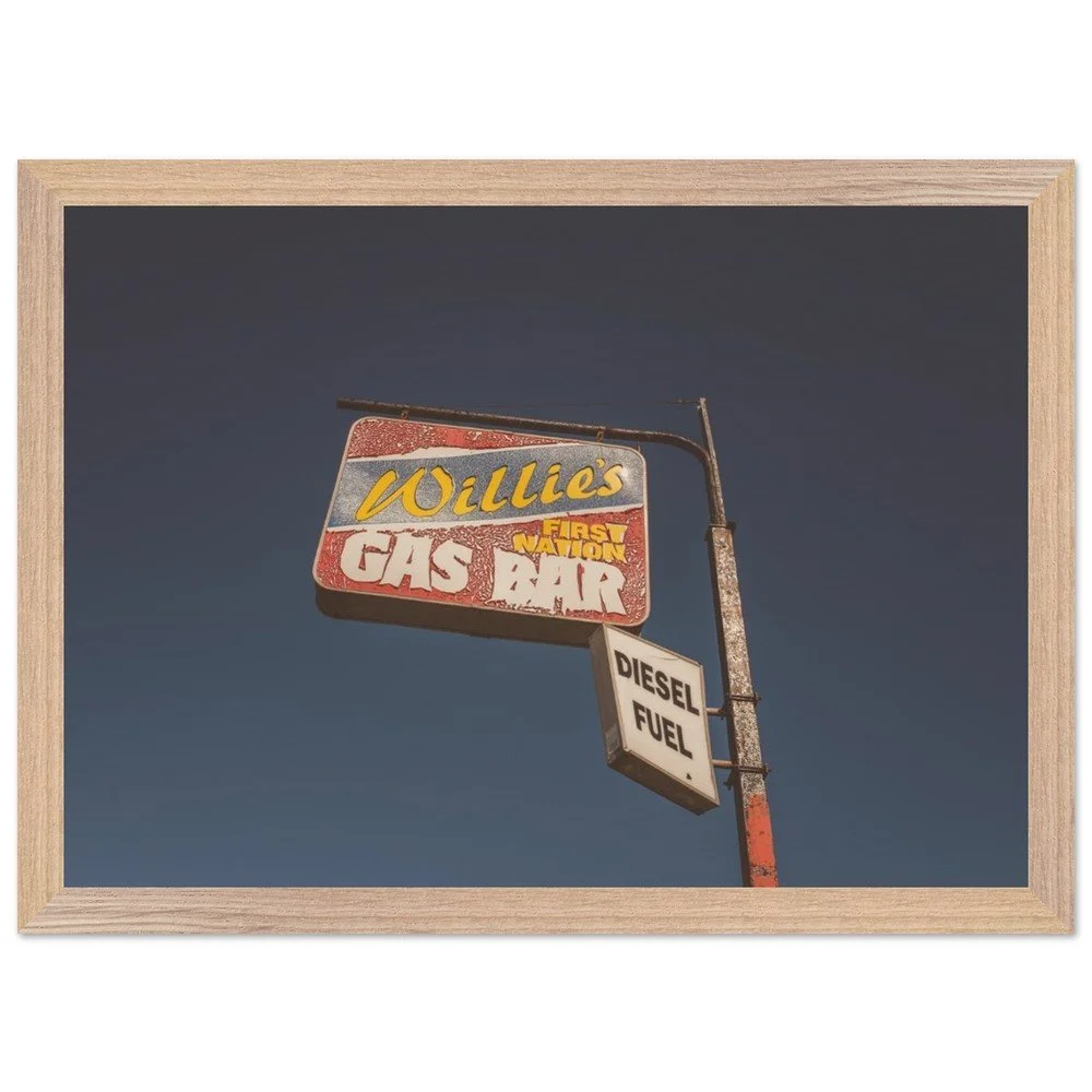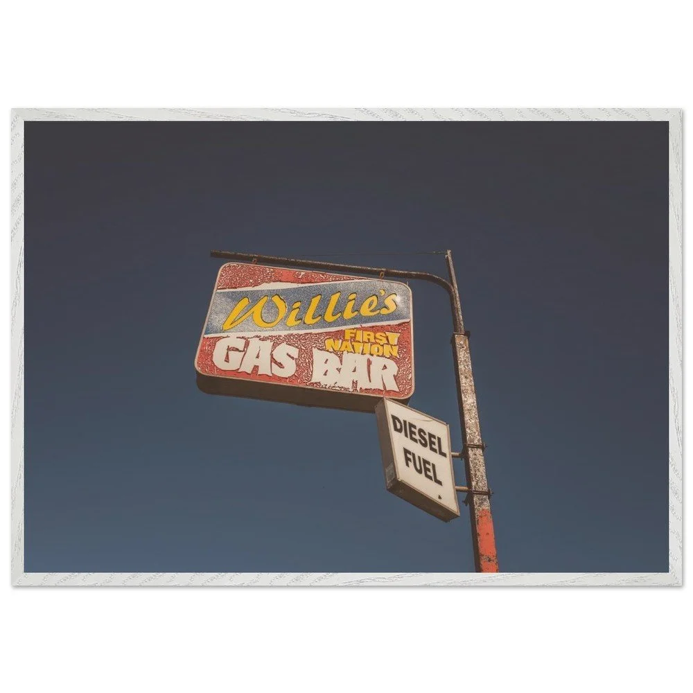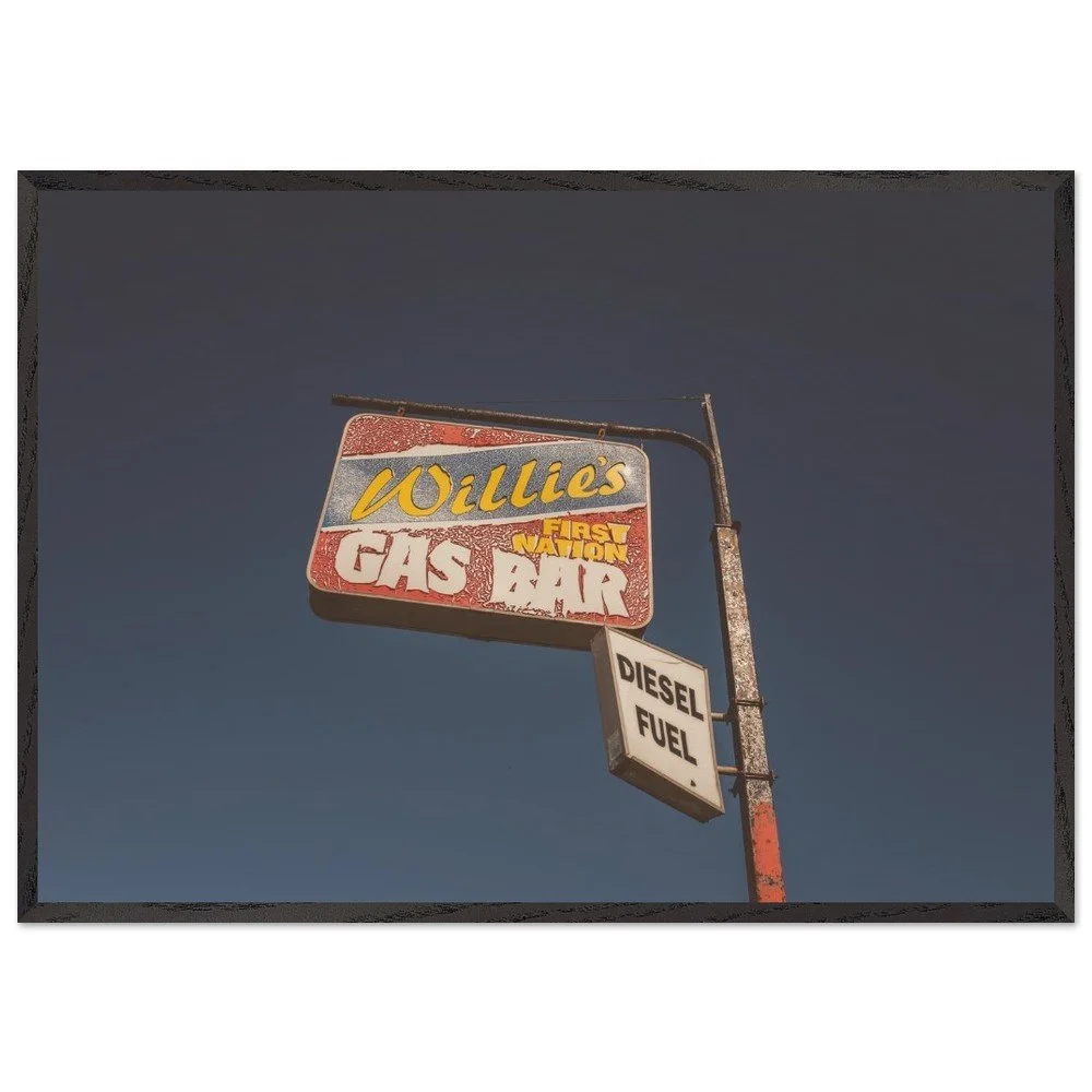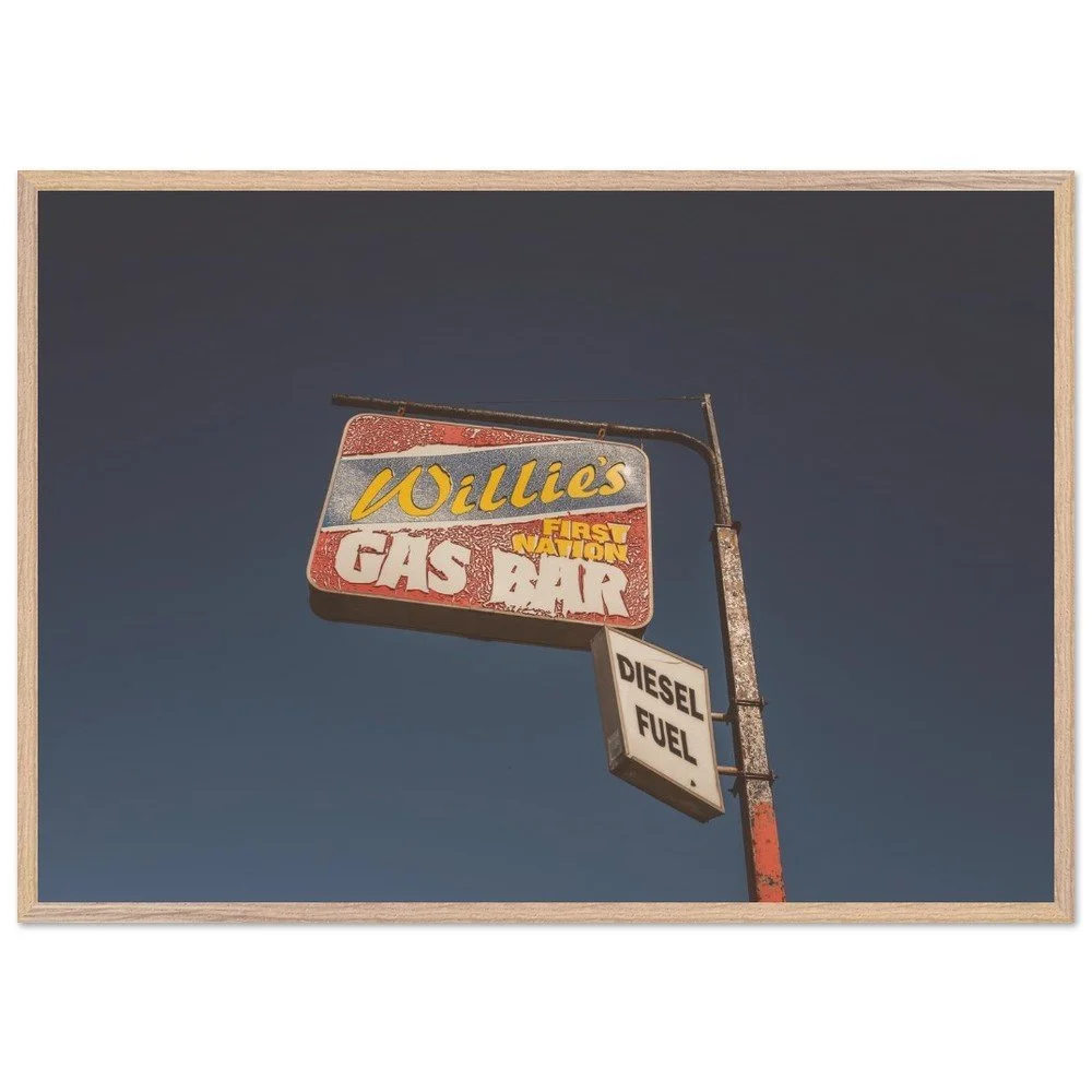 Bring the open road home with our "Willie's Gas Bar" USA Road Sign Framed Poster. This nostalgic Americana design, set against a vibrant blue sky, captures the essence of a classic USA road trip. Printed on museum-quality, uncoated paper with a matte finish, it offers exceptional detail and world-class quality.